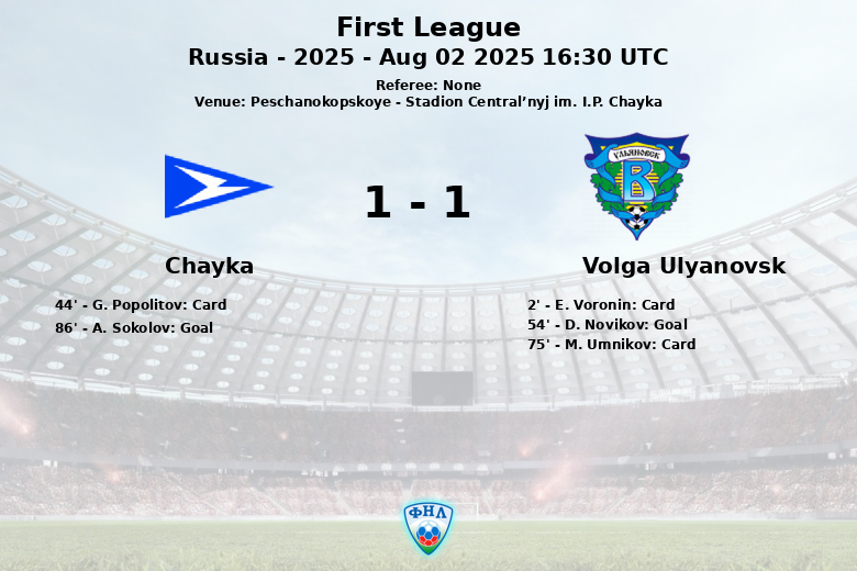 Peschanokopskoye fue testigo de un partido disputado en el Stadion Central’nyj im. I.P. Chayka entre el Chayka y el Volga Ulyanovsk, correspondiente a la tercera jornada de la temporada 2025 de la First League rusa. El encuentro, marcado por la intensidad y la lucha en el mediocampo, finalizó con un empate 1-1 que dejó un sabor agridulce para ambos equipos.