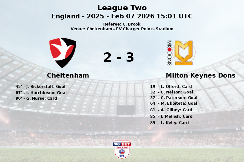 El partido comenzó con el Milton Keynes Dons tomando la iniciativa. L. Offord recibió una tarjeta amarilla en el minuto 19, pero esto no frenó el impulso del equipo. C. Nelson abrió el marcador en el minuto 32, con una asistencia de L. Kelly, seguido por un gol de C. Paterson en el minuto 37. Justo antes del descanso, J. Bickerstaff descontó para el Cheltenham en el minuto 45, dejando el marcador apretado.