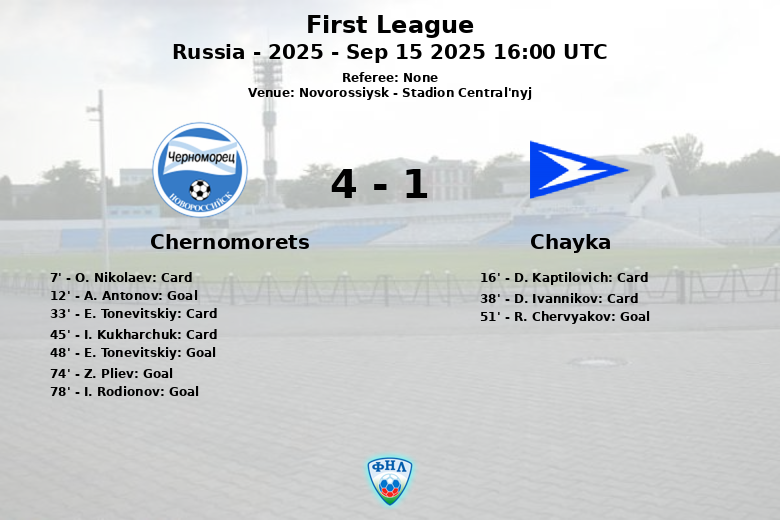 Novorossiysk, Rusia – En un encuentro disputado en el Stadion Central’nyj, el Chernomorets se impuso al Chayka en un partido vibrante correspondiente a la décima jornada de la First League. El partido, jugado el 15 de septiembre de 2025, estuvo marcado por la intensidad y la cantidad de tarjetas mostradas.