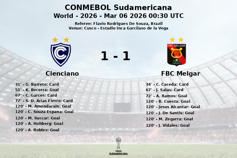 El marcador se abrió al minuto 51 con un gol de K. Becerra para Cienciano, tras una asistencia de C. Garces. Melgar reaccionó y encontró el empate al minuto 72 gracias a A. Ramos. El encuentro se mantuvo igualado hasta el final del tiempo reglamentario, llegando a una dramática definición por penales.