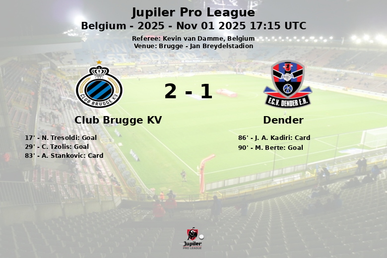 Brugge, Bélgica – El Club Brugge KV demostró su superioridad en casa al vencer a Dender con un marcador de 2 a 1 en un partido de la Jupiler Pro League disputado en el Jan Breydelstadion. Bajo la atenta mirada del árbitro Kevin van Damme, el Brugge controló el ritmo del encuentro con una posesión del 68%.