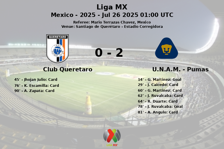 Santiago de Querétaro, México – En un encuentro disputado en el Estadio Corregidora, Pumas de la U.N.A.M. venció a Club Querétaro en un partido marcado por la intensidad y la cantidad de amonestaciones. G. Martinez abrió el marcador para los universitarios al minuto 14, tras una asistencia de R. Lopez, dando una ventaja temprana al equipo visitante.