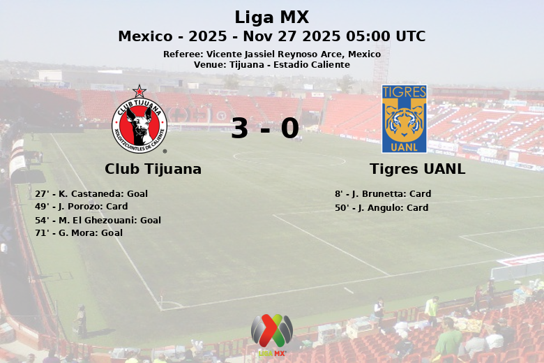 El partido inició con una tarjeta amarilla para Brunetta de Tigres al minuto 8. La primera mitad concluyó con un gol de Castaneda para Tijuana al minuto 27, tras una asistencia de Inzunza, adelantando al equipo fronterizo. En la segunda mitad, Tijuana consolidó su dominio. El Ghezouani amplió la ventaja al minuto 54, nuevamente con asistencia de Castaneda. Más tarde, al minuto 71, Mora sentenció el encuentro con un tercer gol, esta vez asistido por Blanco.