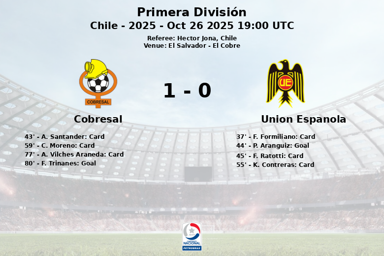 En un encuentro disputado en El Cobre, Cobresal logró una ajustada victoria sobre Unión Española con un marcador de 1-0. El partido, correspondiente a la fecha 25 de la Primera División chilena, estuvo marcado por la intensidad y la disputa en el mediocampo.