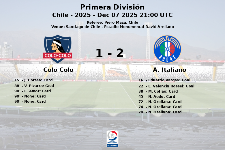 Sustituciones en el equipo de a. italiano: en el minuto 57 ingresó M. Collao y salió O. J. Rojas Munoz, en el minuto 64 ingresó Eduardo Vargas y salió L. Riveros, en el minuto 64 ingresó N. Aedo y salió Y. Salazar, en el minuto 82 ingresó E. Ferrario y salió T. Leyton, en el minuto 82 ingresó L. Valencia Rossel y salió L. Palacios