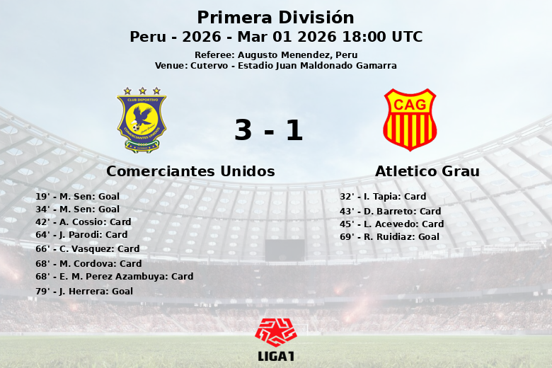 Comerciantes Unidos tomó la delantera tempranamente gracias a un penal convertido por M. Sen al minuto 19. Sen volvería a aparecer al minuto 34, esta vez con un gol de jugada, tras una asistencia de A. Cossio, ampliando la ventaja para los locales. Sin embargo, el Atlético Grau no se rindió y descontó al minuto 69 mediante otro penal, esta vez anotado por R. Ruidiaz.