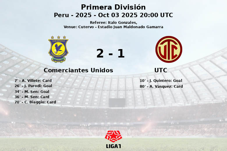 A pesar de tener mayor posesión del balón (68%) y un mayor número de tiros (11, con 3 a puerta y 7 fuera) y corners (6), UTC no logró concretar su dominio en el marcador. El partido se caracterizó por un juego intenso, con 14 faltas cometidas por Comerciantes Unidos y 6 por UTC. C. Biaggio de Comerciantes Unidos y A. Vasquez de UTC también recibieron tarjetas amarillas en el transcurso del encuentro. Finalmente, Comerciantes Unidos se llevó la victoria en casa, demostrando gran efectividad en ataque a pesar del dominio territorial de su rival.