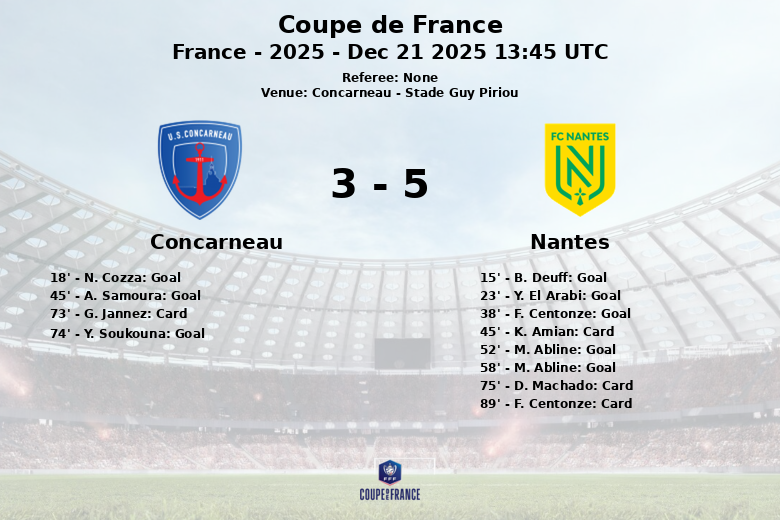 En la segunda mitad, M. Abline marcó al minuto 52, asistido por F. Centonze, y luego nuevamente al minuto 58, esta vez con asistencia de Y. El Arabi, ampliando aún más la ventaja del Nantes. Y. Soukouna descontó para el Concarneau al minuto 74, asistido por O. Daf. El partido fue intenso, con tarjetas amarillas para G. Jannez (Concarneau), D. Machado y F. Centonze (Nantes).