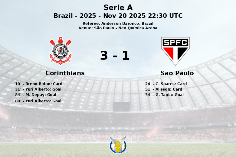 En la segunda mitad, São Paulo reaccionó y G. Tapia igualó el marcador al minuto 54, con asistencia de C. Soares. Alisson de São Paulo también recibió una tarjeta amarilla al minuto 51. Sin embargo, Corinthians demostró su poderío ofensivo en los minutos finales. M. Depay anotó al minuto 84 y Yuri Alberto selló la victoria al minuto 89, completando su doblete.