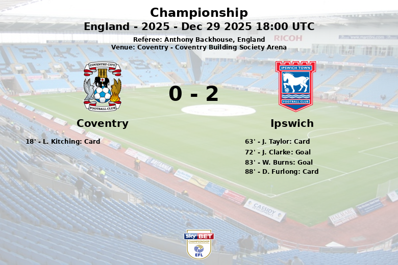 El primer tiempo transcurrió sin goles, aunque la intensidad se hizo presente con una tarjeta amarilla para L. Kitching del Coventry en el minuto 18. Tras el descanso, el Ipswich logró romper el empate gracias a un gol de J. Clarke en el minuto 72, con asistencia de M. Nunez. La ventaja del Ipswich se amplió en el minuto 83 con un gol de W. Burns, nuevamente asistido por M. Nunez.