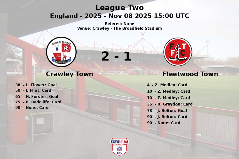 El encuentro también estuvo marcado por la disciplina, con numerosas tarjetas amarillas mostradas a ambos equipos. En total, Fleetwood Town recibió tres tarjetas amarillas y una roja, mientras que Crawley Town vio dos tarjetas amarillas. El partido tuvo un total de 18 faltas, 12 de Fleetwood Town y 6 de Crawley Town.