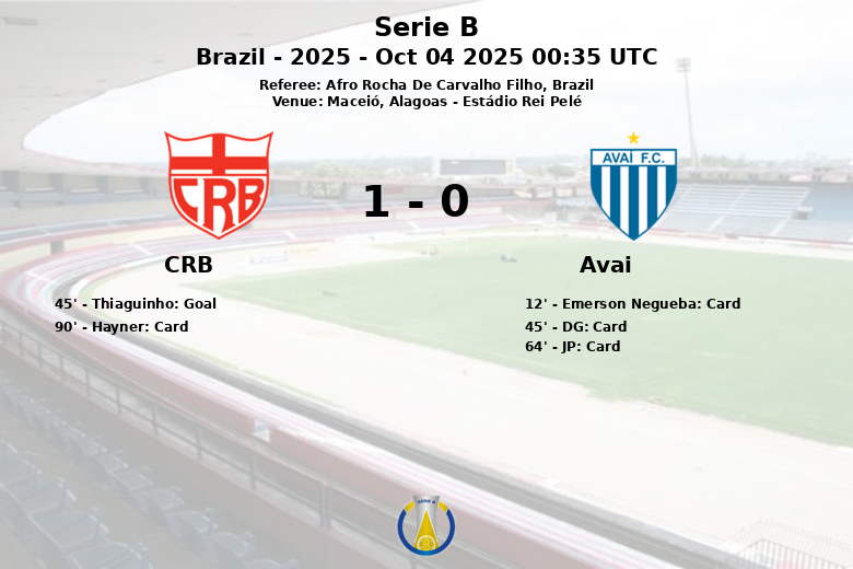 Maceió, Alagoas – En un partido disputado en el Estádio Rei Pelé, CRB venció a Avaí con un marcador ajustado. El encuentro, correspondiente a la jornada 30 de la Serie B brasileña, se caracterizó por la intensidad y las numerosas tarjetas amarillas mostradas por el árbitro Afro Rocha De Carvalho Filho.