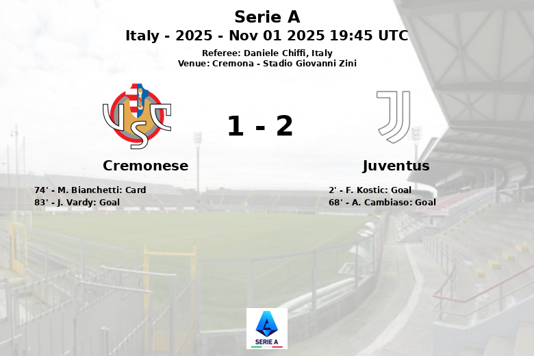 En un encuentro emocionante disputado en el Stadio Giovanni Zini de Cremona, Juventus se impuso ante Cremonese en un partido correspondiente a la décima jornada de la Serie A. El equipo visitante se adelantó temprano en el marcador, al minuto 2, gracias a un gol de F. Kostic. El partido continuó con un ritmo intenso, con ambos equipos buscando generar oportunidades. Fue hasta el minuto 68 que Juventus logró ampliar su ventaja con un gol de A. Cambiaso. Cremonese no se rindió y logró descontar al minuto 83 con un gol de J. Vardy, asistido por D. Johnsen, pero no fue suficiente para revertir el resultado.