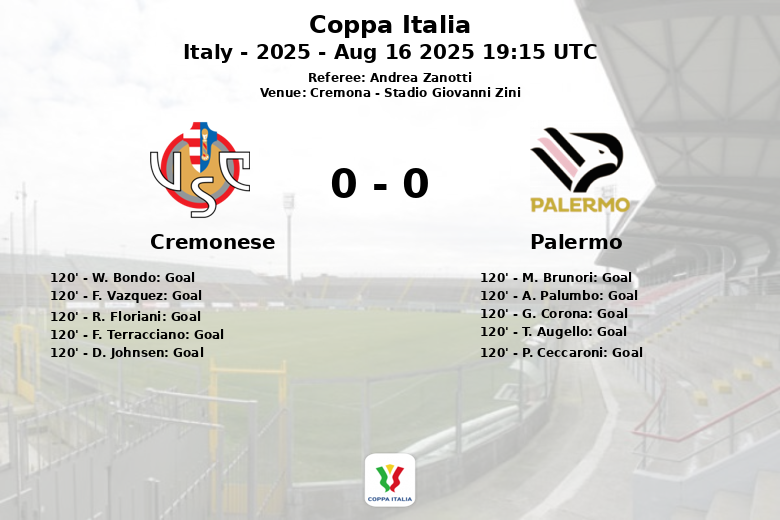 La tensión alcanzó su punto álgido en la tanda de penales. Por Palermo, convirtieron M. Brunori, A. Palumbo, G. Corona, T. Augello y P. Ceccaroni. Cremonese respondió con goles de W. Bondo, F. Vazquez, R. Floriani y F. Terracciano, pero el fallo crucial de D. Johnsen le dio la victoria y el pase a la siguiente ronda a Palermo. El árbitro Andrea Zanotti fue el encargado de dirigir el encuentro de la primera ronda de la Coppa Italia.
