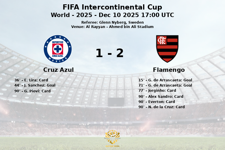 Al Rayyan, Qatar – En un partido disputado en el Ahmed bin Ali Stadium, el Flamengo derrotó a Cruz Azul en los cuartos de final de la Copa Intercontinental de la FIFA, en un encuentro donde el marcador final no refleja la paridad que se vio en el campo. Bajo la atenta mirada del árbitro sueco Glenn Nyberg, el partido, que se jugó en la ciudad de Al Rayyan, estuvo marcado por la intensidad y las constantes interrupciones.