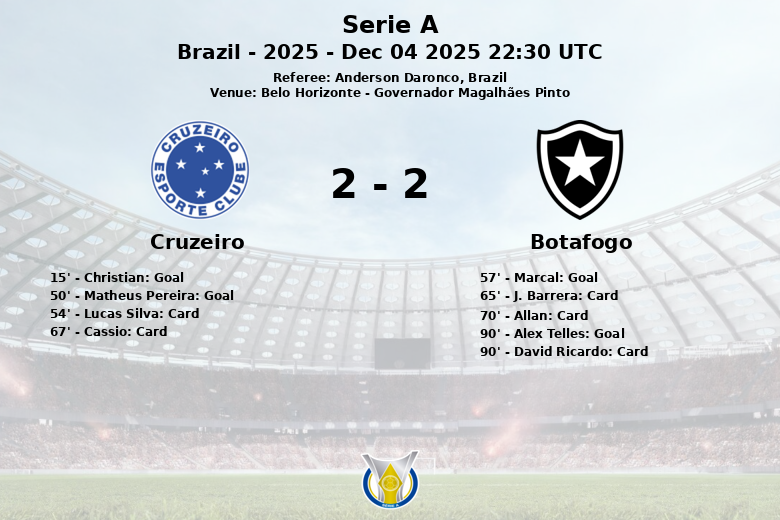 El partido, arbitrado por Anderson Daronco, se caracterizó por un equilibrio en las estadísticas, con un ligero dominio en la posesión para Botafogo (57%) y un número similar de disparos a puerta por ambos equipos (Cruzeiro 4, Botafogo 5). La paridad en el marcador refleja la lucha constante y el esfuerzo de ambos equipos en el terreno de juego.