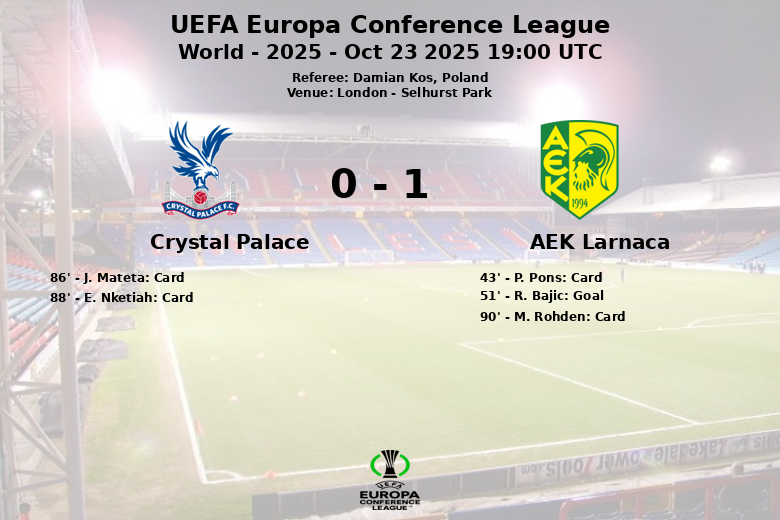 London, 23 de octubre de 2025 – El AEK Larnaca sorprendió al Crystal Palace en su propio terreno, Selhurst Park, con una victoria por la mínima en el partido correspondiente a la segunda jornada de la fase de grupos de la UEFA Europa Conference League. A pesar de la clara superioridad del Crystal Palace en la posesión del balón (67% frente al 33% del AEK Larnaca) y un dominio territorial evidente, el equipo chipriota demostró ser más efectivo de cara a la portería.