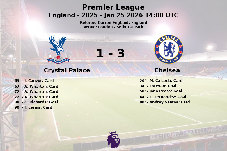 El primer gol llegó al minuto 34, cortesía de Estevao, abriendo el camino para los ‘blues’. En la segunda mitad, Joao Pedro amplió la ventaja al minuto 50, con una asistencia nuevamente de Estevao. El tercer gol del Chelsea llegó desde el punto penal al minuto 64, con Enzo Fernandez como ejecutor. El Crystal Palace, que sufrió la expulsión de A. Wharton al minuto 72, logró descontar al minuto 88 con un gol de C. Richards, asistido por C. Riad, pero no fue suficiente para cambiar el rumbo del partido. El encuentro también estuvo marcado por las tarjetas, con cuatro amarillas y una roja para el Crystal Palace, y dos amarillas para el Chelsea. El árbitro Darren England tuvo una tarde ocupada. A pesar de la mayor cantidad de tiros del Crystal Palace (12 vs 10), la efectividad del Chelsea fue clave para asegurar la victoria.