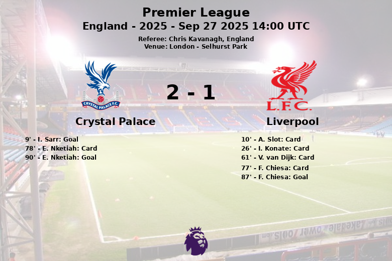 I. Sarr abrió el marcador para el Crystal Palace en el minuto 9, sorprendiendo a la defensa del Liverpool. A pesar de controlar el 72% de la posesión y realizar 20 disparos, el Liverpool solo logró concretar cuatro tiros a puerta. La frustración se hizo evidente con tres tarjetas amarillas mostradas a jugadores del Liverpool: A. Slot, I. Konate y V. van Dijk. El Crystal Palace, por su parte, recibió una sola amonestación.