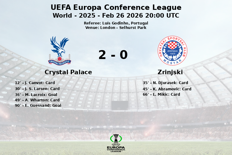 En un encuentro correspondiente a la ronda de 32 de la UEFA Europa Conference League, el Crystal Palace se impuso al Zrinjski con un marcador de 2 a 0 en su estadio, Selhurst Park, en Londres. El partido, arbitrado por el portugués Luís Godinho, estuvo marcado por el claro dominio del equipo local, que gozó de un 65% de posesión del balón.