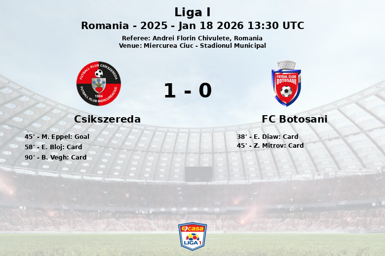 El encuentro, arbitrado por Andrei Florin Chivulete, estuvo marcado por la intensidad y la disputa en el centro del campo. Se cometieron un total de 28 faltas, reflejo de la lucha constante por el control del juego. El FC Botosani recibió dos tarjetas amarillas, mientras que el Csikszereda vio una. A pesar de tener más tiros a puerta que su rival, el FC Botosani no pudo superar la defensa del Csikszereda y regresar a casa con puntos. El Csikszereda celebra una importante victoria en casa que los impulsa en la tabla de la Liga I.