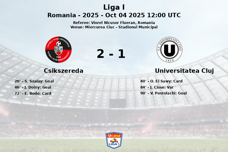 El Universitatea Cluj luchó por meterse en el partido, pero se vio frustrado por la defensa del Csikszereda. O. El Sawy recibió una tarjeta amarilla al minuto 40. Al minuto 84, la tensión subió cuando un gol de J. Cisse fue anulado por fuera de juego tras revisión del VAR. Sin embargo, el Universitatea Cluj no se rindió y V. Postolachi logró descontar al minuto 90, rescatando un punto valioso para su equipo.