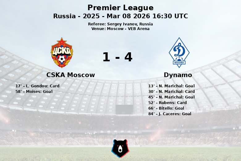 El Dynamo tomó la delantera temprano, con un gol de N. Marichal en el minuto 13 tras una excelente asistencia de Bitello. La alegría del Dynamo se vio contrastada poco después cuando el CSKA Moscow sufrió la expulsión de L. Gondou en el minuto 17 por tarjeta roja, dejando a su equipo con un hombre menos durante gran parte del partido. Antes del descanso, N. Marichal volvió a marcar para el Dynamo, ampliando la ventaja.