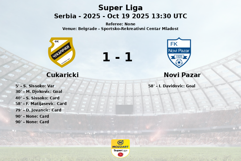 Belgrado, Serbia – En un encuentro disputado en el Sportsko-Rekreativni Centar Mladost, Čukarički y Novi Pazar igualaron en un partido correspondiente a la jornada 12 de la Super Liga serbia. El partido, jugado el 19 de octubre de 2025, tuvo momentos de gran intensidad y alternativas en el marcador.