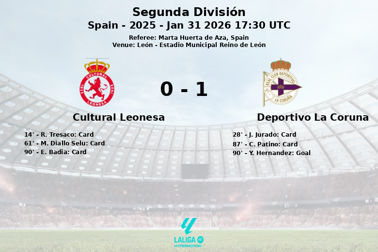Cuando todo parecía indicar que la Cultural Leonesa se llevaría la victoria, un penal en el tiempo de descuento, convertido por Y. Hernandez, le dio el empate al Deportivo La Coruña. El partido finalizó con reparto de puntos, dejando un sabor agridulce para ambos equipos en el Estadio Municipal Reino de León.