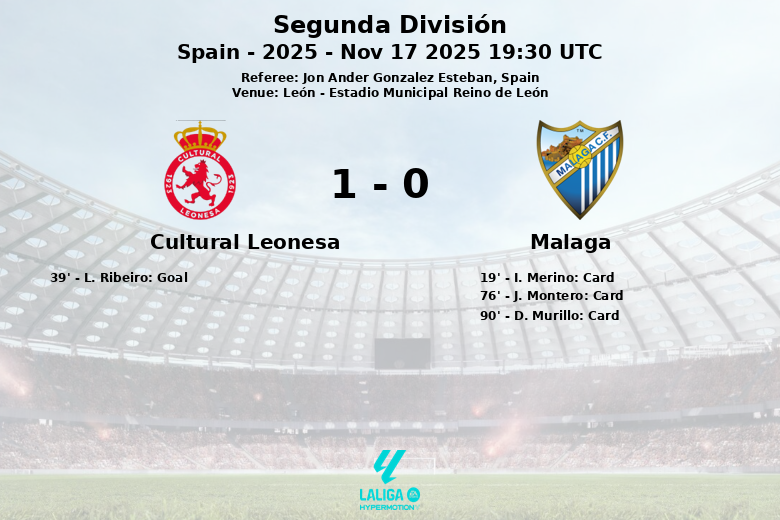 León, España – En un encuentro disputado en el Estadio Municipal Reino de León, la Cultural Leonesa se llevó la victoria ante el Málaga con un marcador de 1 a 0. A pesar del dominio del balón por parte del Málaga, que alcanzó un 65% de posesión y generó un total de 16 disparos, solo 3 de ellos lograron dirigirse a la portería rival. La Cultural Leonesa, con una posesión del 35%, aprovechó una de sus escasas oportunidades para marcar. El gol llegó al minuto 39 gracias a L. Ribeiro, quien remató a la red tras una asistencia de I. Calero. El partido fue intenso y disputado, con un total de 20 faltas cometidas (14 por el Málaga y 6 por la Cultural Leonesa) y tres tarjetas amarillas (dos para el Málaga y una para la Cultural). El Málaga terminó el partido con un jugador menos debido a la tarjeta roja directa mostrada a D. Murillo en el minuto 90. El árbitro Jon Ander Gonzalez Esteban, de España, tuvo una noche agitada dirigiendo el encuentro correspondiente a la jornada 14 de la Segunda División.