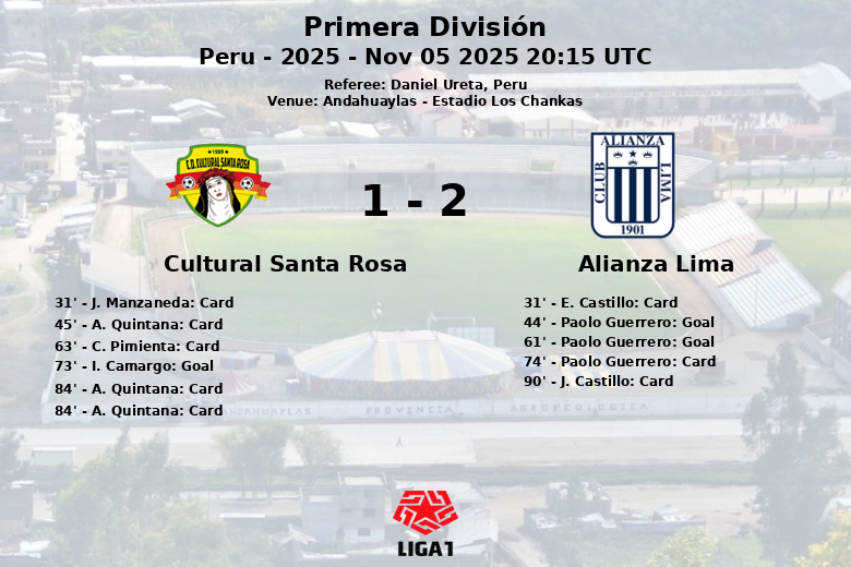 Andahuaylas fue testigo de un partido intenso y lleno de tarjetas entre Alianza Lima y Cultural Santa Rosa, válido por la fecha 9 del Clausura de la Primera División peruana. El encuentro, disputado en el Estadio Los Chankas, terminó con victoria para el equipo blanquiazul.
