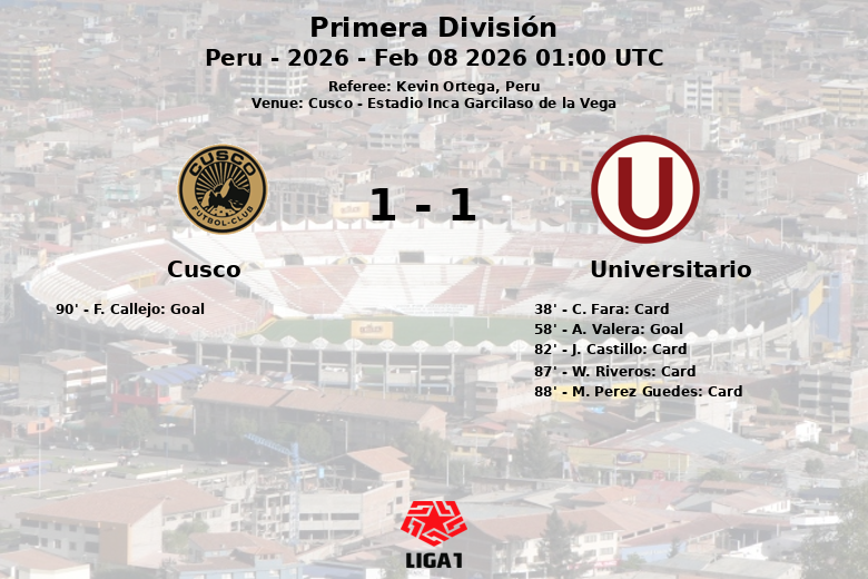 El marcador se abrió en el minuto 58 gracias a un gol de Alex Valera, tras una asistencia de J. Carabali, dando la ventaja al equipo visitante. Sin embargo, Cusco no se rindió y siguió buscando el empate, que finalmente llegó en el minuto 90 a través de un penal convertido por F. Callejo. A pesar del esfuerzo final del equipo local, Universitario supo defender su ventaja y se llevó los tres puntos. El partido fue intenso, con un total de 10 faltas cometidas por Universitario y 12 por Cusco. El equipo visitante también acumuló cuatro tarjetas amarillas, mientras que Cusco logró evitar amonestaciones.