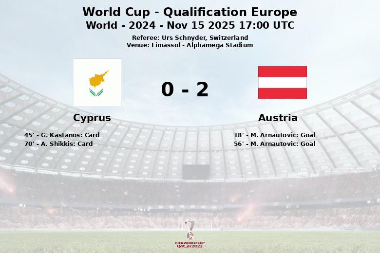 Marko Arnautovic fue la figura destacada del encuentro, anotando un gol de penalti en el minuto 18 y ampliando la ventaja con un tanto adicional en el minuto 56, con asistencia de K. Danso. A pesar de la tarjeta amarilla recibida por G. Kastanos de Chipre al filo del descanso y otra por A. Shikkis en el minuto 70, el equipo local no logró inquietar la portería austriaca.