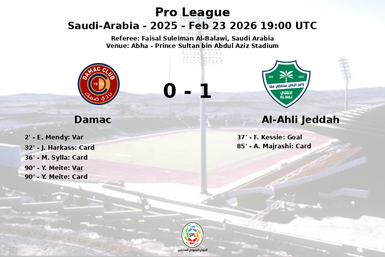 El Al-Ahli Jeddah se llevó una ajustada victoria en su visita al Prince Sultan bin Abdul Aziz Stadium, derrotando al Damac en un encuentro marcado por la intensidad y las decisiones arbitrales. El único gol del partido llegó en el minuto 37, obra de F. Kessie, asistido por Ibanez, que dio la ventaja definitiva al equipo visitante.