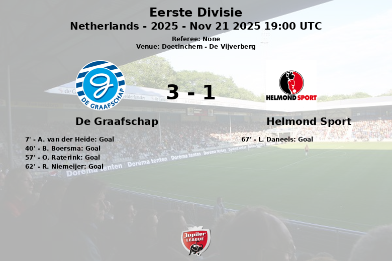 En la segunda mitad, O. Raterink amplió la ventaja al minuto 57, con asistencia de A. van der Heide. Poco después, R. Niemeijer anotó el cuarto gol para el De Graafschap, asistido por I. El Kadiri. El Helmond Sport logró descontar al minuto 67 mediante un penalti convertido por L. Daneels.