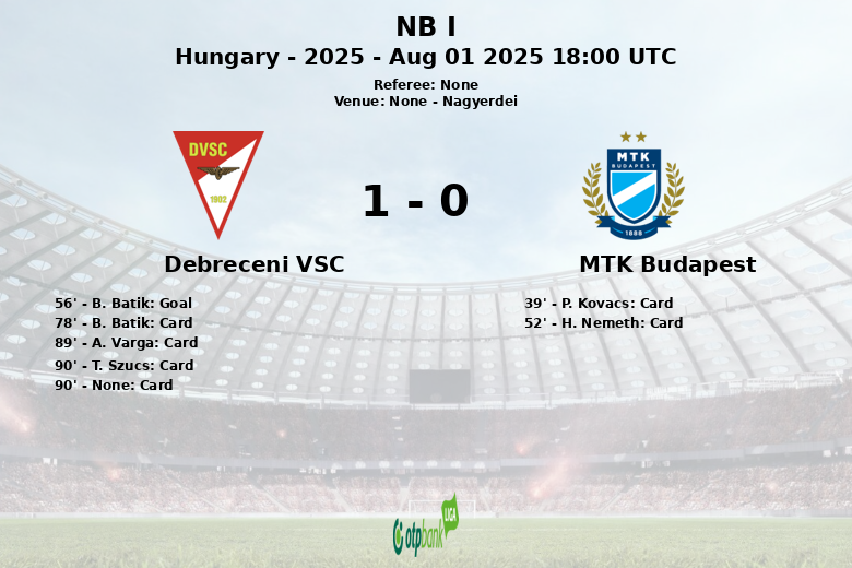 Nagyerdei fue testigo de un encuentro reñido donde el Debreceni VSC logró imponerse al MTK Budapest con un marcador de 1-0. A pesar de que el MTK Budapest dominó la posesión del balón con un 64% frente al 36% del Debreceni VSC, no logró traducir esa superioridad en el marcador. El Debreceni VSC, más efectivo en sus llegadas, aprovechó una de sus 13 oportunidades para anotar el único gol del partido, obra de B. Batik al minuto 56, con asistencia de B. Dzsudzsak.