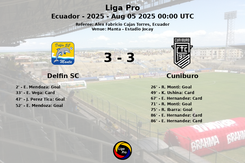 Delfín SC comenzó con fuerza, abriendo el marcador al minuto 2 con un gol de E. Mendoza, asistido por N. Gallardo. Cuniburo respondió al minuto 26 con una anotación de R. Monti, tras un pase de D. Luna. Justo después del entretiempo, J. Perez Tica devolvió la ventaja al Delfín al minuto 47 con asistencia de E. Vega. La alegría local se extendió cuando E. Mendoza firmó su doblete al minuto 52.