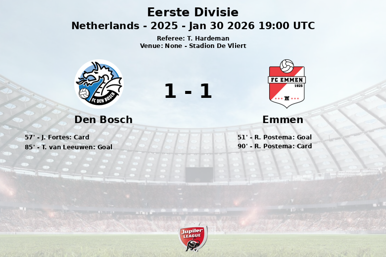 El Emmen se adelantó en el marcador al minuto 51 gracias a un gol de R. Postema, asistido por V. Besuijen. Sin embargo, el Den Bosch no se rindió y buscó insistentemente el empate. La insistencia local finalmente dio sus frutos al minuto 85, cuando T. van Leeuwen logró batir al portero rival, estableciendo el 1-1 definitivo.