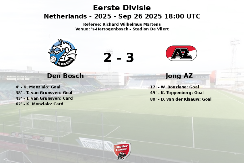 El Den Bosch se adelantó temprano con un gol de penal de K. Monzialo en el minuto 4, con asistencia previa. Sin embargo, Jong AZ respondió con un gol de W. Bouziane en el minuto 17, nivelando el marcador. Antes del descanso, T. van Grunsven volvió a poner en ventaja al Den Bosch en el minuto 38, gracias a una asistencia de Monzialo. El mismo van Grunsven recibió una tarjeta amarilla poco después, en el minuto 43.