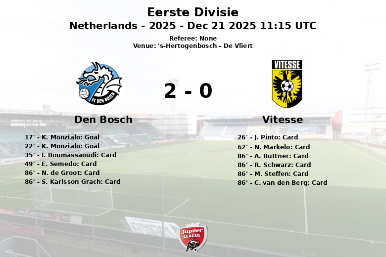 ‘s-Hertogenbosch, Países Bajos – En un encuentro disputado en el estadio De Vliert, el Den Bosch logró una victoria clave sobre el Vitesse en la jornada 21 de la Eerste Divisie. El partido, jugado el 21 de diciembre de 2025, se caracterizó por una alta intensidad y numerosas amonestaciones, reflejo de la tensión palpable en el terreno de juego.