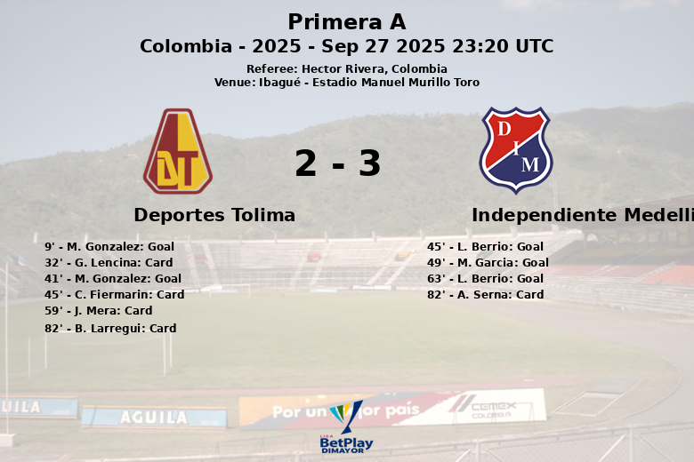 Deportes Tolima comenzó dominando el partido, reflejando su superioridad en el marcador con dos goles de M. Gonzalez en los minutos 9 y 41, con asistencias de J. P. Torres Patino y Y. D. Hurtado Torres respectivamente. Sin embargo, el Independiente Medellín no se rindió. L. Berrio descontó de penal justo antes del descanso, dando un impulso anímico a su equipo.