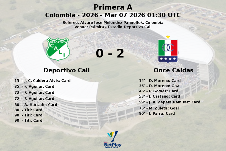 A pesar de que el Deportivo Cali mantuvo la posesión del balón en un 62% del tiempo, Once Caldas fue más efectivo de cara al arco rival. El primer gol del partido llegó en el minuto 36 a través de un penal convertido por D. Moreno, dándole la ventaja al equipo visitante. En la segunda mitad, M. Zuleta amplió la diferencia en el minuto 75 con un gol que consolidó la victoria de Once Caldas.