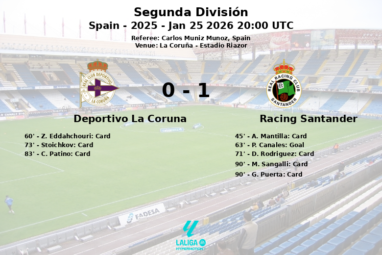 La Coruña, España – En un encuentro disputado en el Estadio Riazor, el Racing Santander se impuso al Deportivo La Coruña con un marcador de 1 a 0. El partido, correspondiente a la jornada 23 de la Segunda División, estuvo marcado por la intensidad y la lucha en el mediocampo.