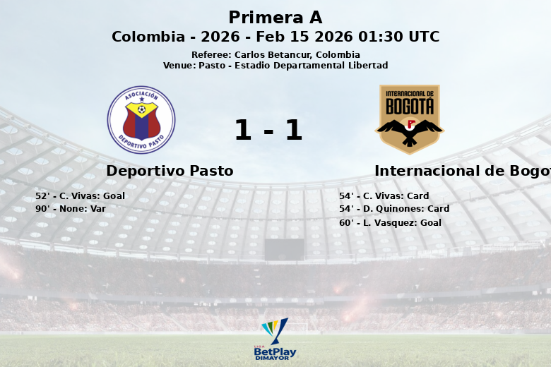 El partido comenzó con una sustitución temprana en el Deportivo Pasto al minuto 8. La primera mitad transcurrió sin mayores sobresaltos hasta el minuto 52, cuando un desafortunado autogol de C. Vivas del Deportivo Pasto, sin asistencia, abrió el marcador para el Internacional de Bogotá. La respuesta del equipo visitante no se hizo esperar, y al minuto 60, L. Vasquez, con asistencia de K. Parra Atehortua, amplió la ventaja para el Internacional, consolidando su dominio en el marcador.