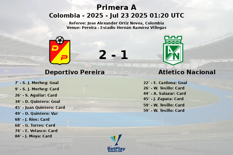 El partido entre Deportivo Pereira y Atlético Nacional, disputado en el Estadio Hernán Ramírez Villegas de Pereira, terminó en un vibrante empate que dejó a los aficionados al borde de sus asientos. Desde el inicio, el encuentro estuvo cargado de intensidad, con el Pereira abriendo el marcador tempranamente al minuto 7 gracias a S. J. Merheg, asistido por J. Ararat. Sin embargo, la alegría local no duró mucho, ya que al minuto 22, E. Cardona igualó para Atlético Nacional.