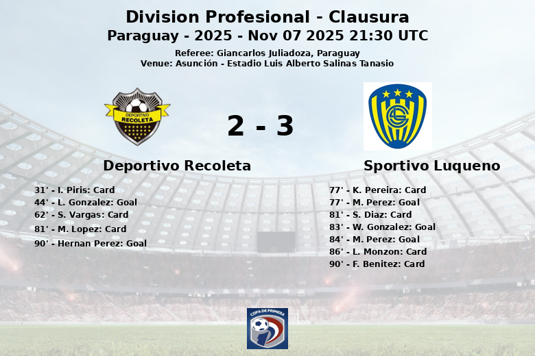Sin embargo, Sportivo Luqueño, con mayor posesión del balón (59% frente al 41% de Recoleta) y mayor número de disparos (15 contra 7), no se rindió. M. Pérez igualó el marcador al minuto 77 mediante un penal. El Luqueño tomó la delantera con goles de W. González (83′) y nuevamente M. Pérez (84′), colocando el marcador en 3-1. Parecía que el partido estaba sentenciado, pero en el minuto 90, Hernán Perez descontó para el Recoleta, sellando un empate que deja un sabor agridulce para ambos equipos. El partido se caracterizó por una alta tensión, reflejada en las 7 tarjetas amarillas mostradas y la expulsión de Piris.