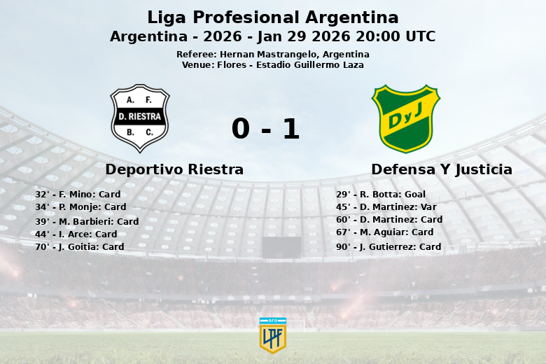 El primer tiempo fue particularmente agitado. A los 29 minutos, R. Botta anotó para Defensa y Justicia, asistido por A. Molinas, pero la alegría duró poco ya que en el minuto 45, un gol de D. Martinez fue anulado por el VAR debido a una mano. Deportivo Riestra recibió cuatro tarjetas amarillas en la primera mitad (F. Mino, P. Monje, M. Barbieri e I. Arce), reflejo de la intensidad en el mediocampo. Defensa y Justicia vio a D. Martinez recibir una amarilla en el segundo tiempo, junto con M. Aguiar y J. Gutierrez. J. Goitia también recibió una tarjeta amarilla para Deportivo Riestra en la segunda mitad.