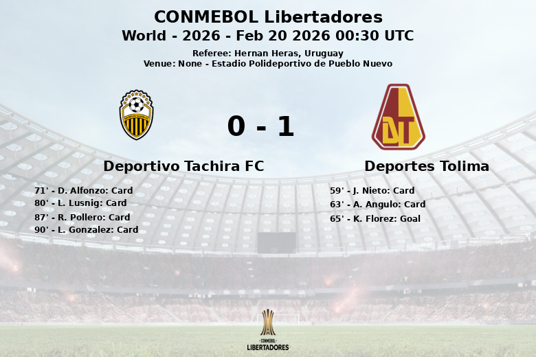 El único gol del partido llegó al minuto 65, obra de K. Florez para Deportes Tolima. El encuentro se vio interrumpido por varias tarjetas, con cuatro amarillas para Táchira y dos para Tolima. La intensidad del juego se reflejó en las 11 faltas cometidas por Tolima, en comparación con las 6 de Táchira.