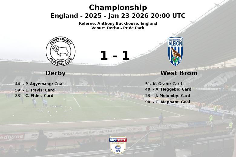 Derby y West Brom protagonizaron un vibrante encuentro en el Pride Park, que culminó con un empate a un gol. A pesar de disfrutar de una mayor posesión del balón (58%), el Derby solo logró concretar un remate a puerta de sus cuatro intentos. El equipo local se adelantó en el minuto 44 gracias a un gol de P. Agyemang. West Brom, aunque con menor posesión (42%), generó un mayor número de oportunidades de gol, con 12 tiros, cuatro de ellos dirigidos a la portería. El partido estuvo marcado por las numerosas faltas (14 del Derby y 13 del West Brom) y las tarjetas amarillas, con dos para el Derby y tres para el West Brom. Cuando parecía que la victoria se quedaría en Derby, C. Mepham anotó para West Brom en el minuto 90, igualando el marcador y asegurando un punto valioso para su equipo. El partido, arbitrado por Anthony Backhouse, se desarrolló en el marco de la jornada 29 de la Championship inglesa.