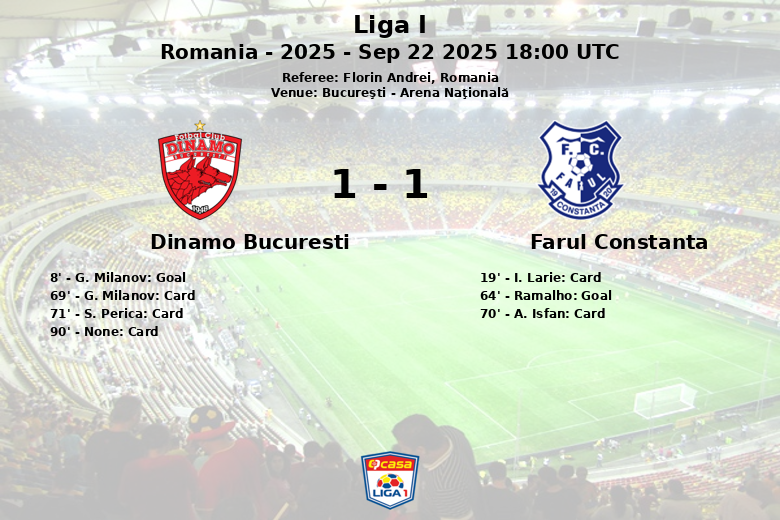 El Dinamo Bucuresti se adelantó temprano en el minuto 8 gracias a un gol de G. Milanov tras una asistencia de D. Armstrong. El Farul Constanta reaccionó en la segunda mitad y logró igualar el marcador en el minuto 64 con un gol de Ramalho.